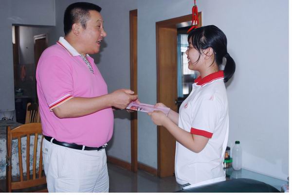 圖為公司黨委副書(shū)記邢金湘(左)將助學(xué)款送到彭雷手中